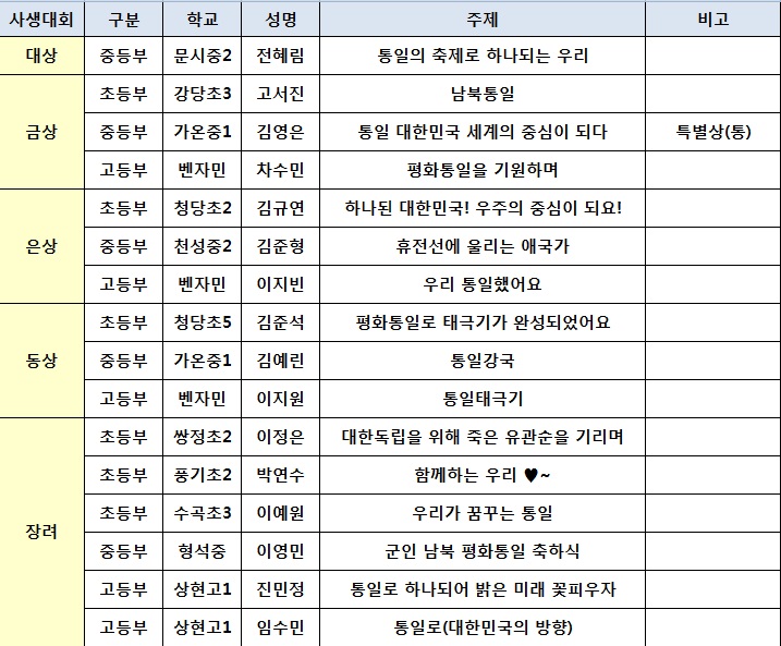 제2회 호국의 달 평화통일기원 "전국 청소년 백일장 및 사생대회 수상자" 명단