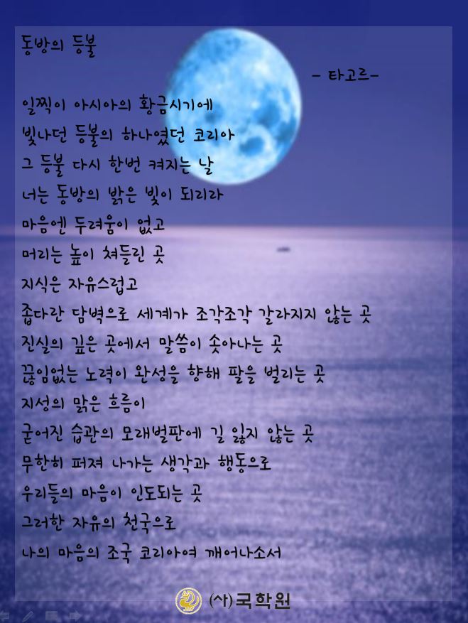 이 시는 1929년 타고르가 일본의 식민지배 아래에서 고통을 겪는 한국인을 격려하기 위해 지은 것이다. 그러나 오늘의 우리에게도 여전히 큰 울림을 주는 시다.