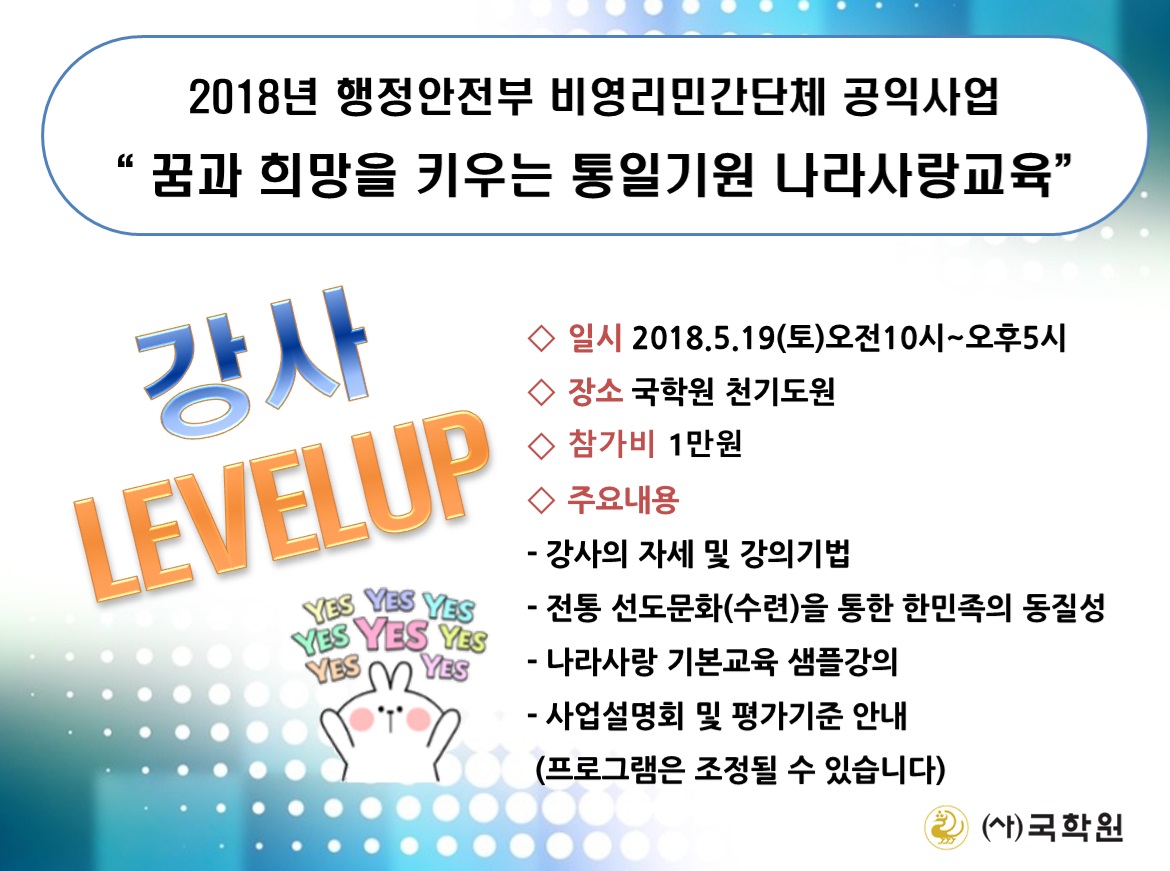 "꿈과 희망을 키우는 통일기원 나라사랑교육" 강사 레벨업이 바로 내일(5/19)에 진행됩니다.
