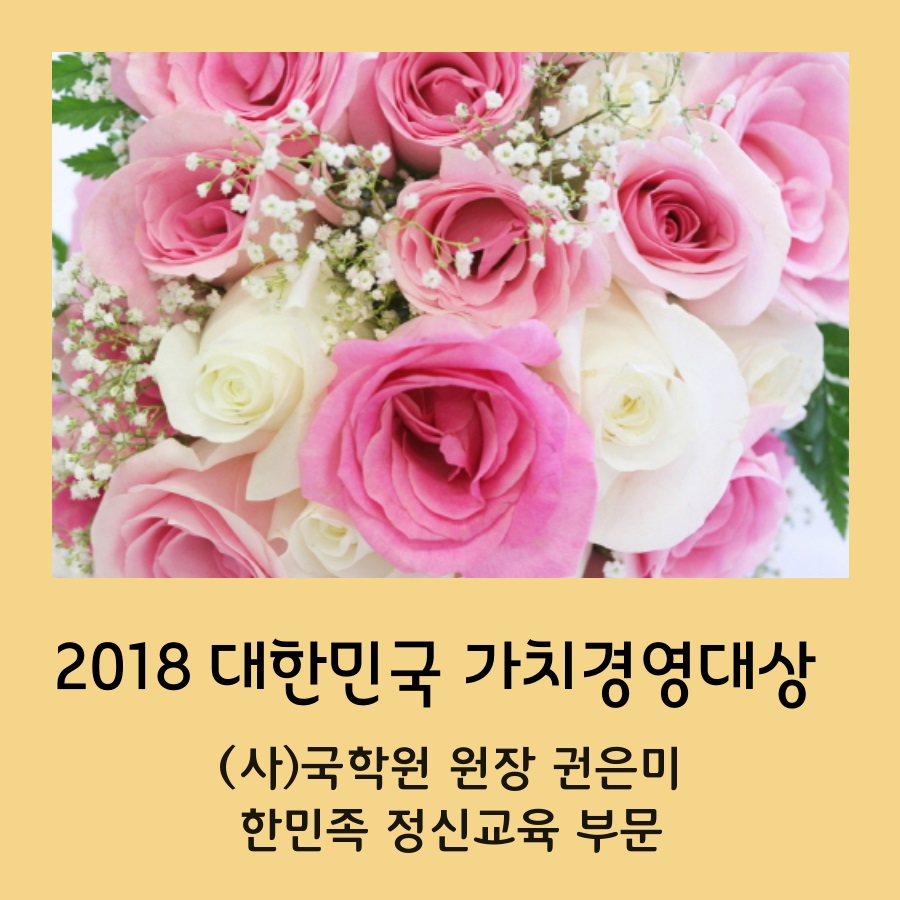 감사합니다헤럴드 경제에서 주최로 하는 "2018 대한민국 가치경영대상, 한민족 정신교육 부문"에 수상을 하게 되었습니다.