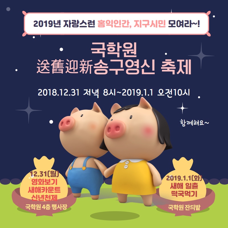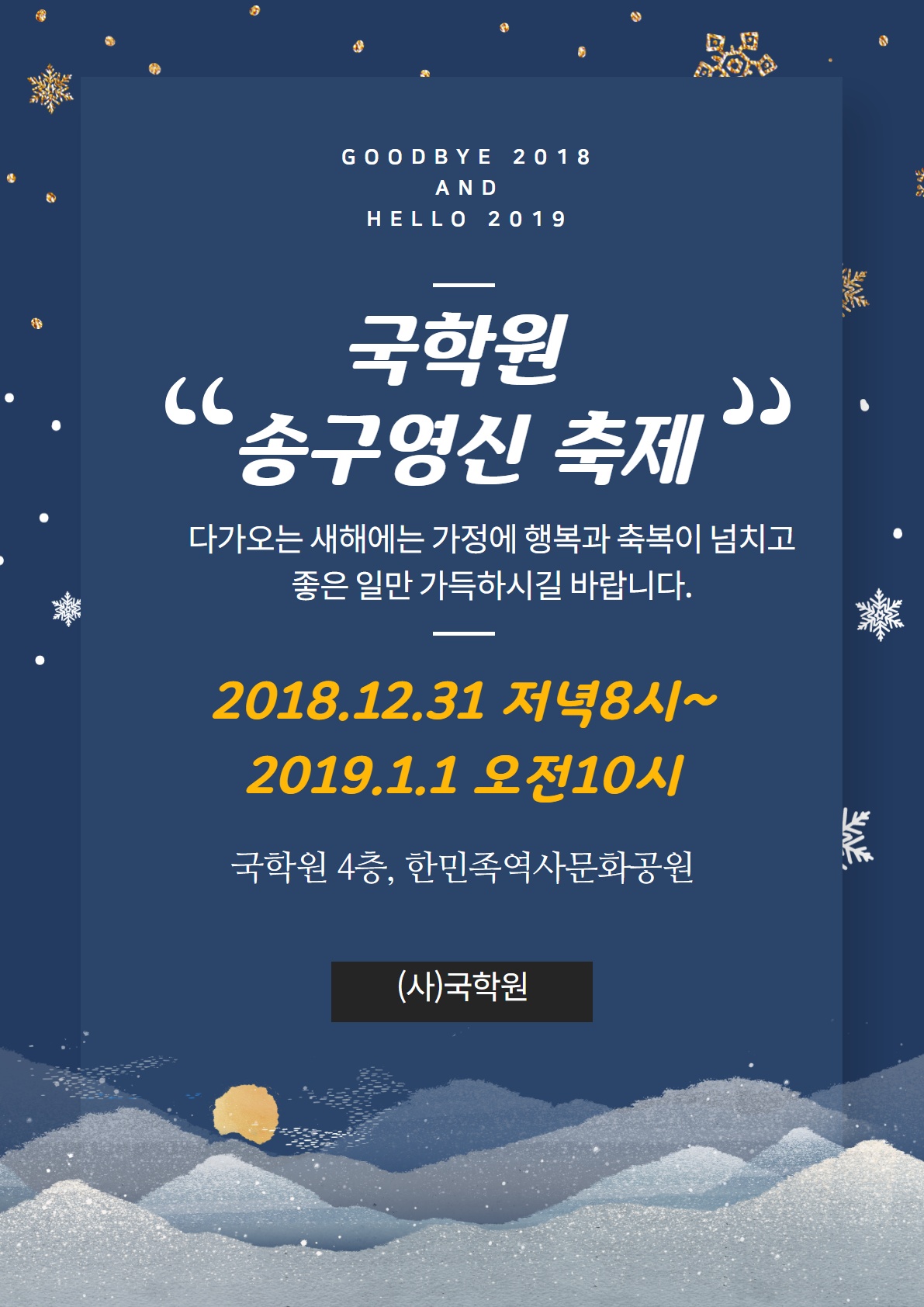 반갑습니다^^2018년을 마무리하고 2019년을 맞이하는 국학원 송구영신 축제에 여러분을 초대합니다!우와~~~함께 해요!