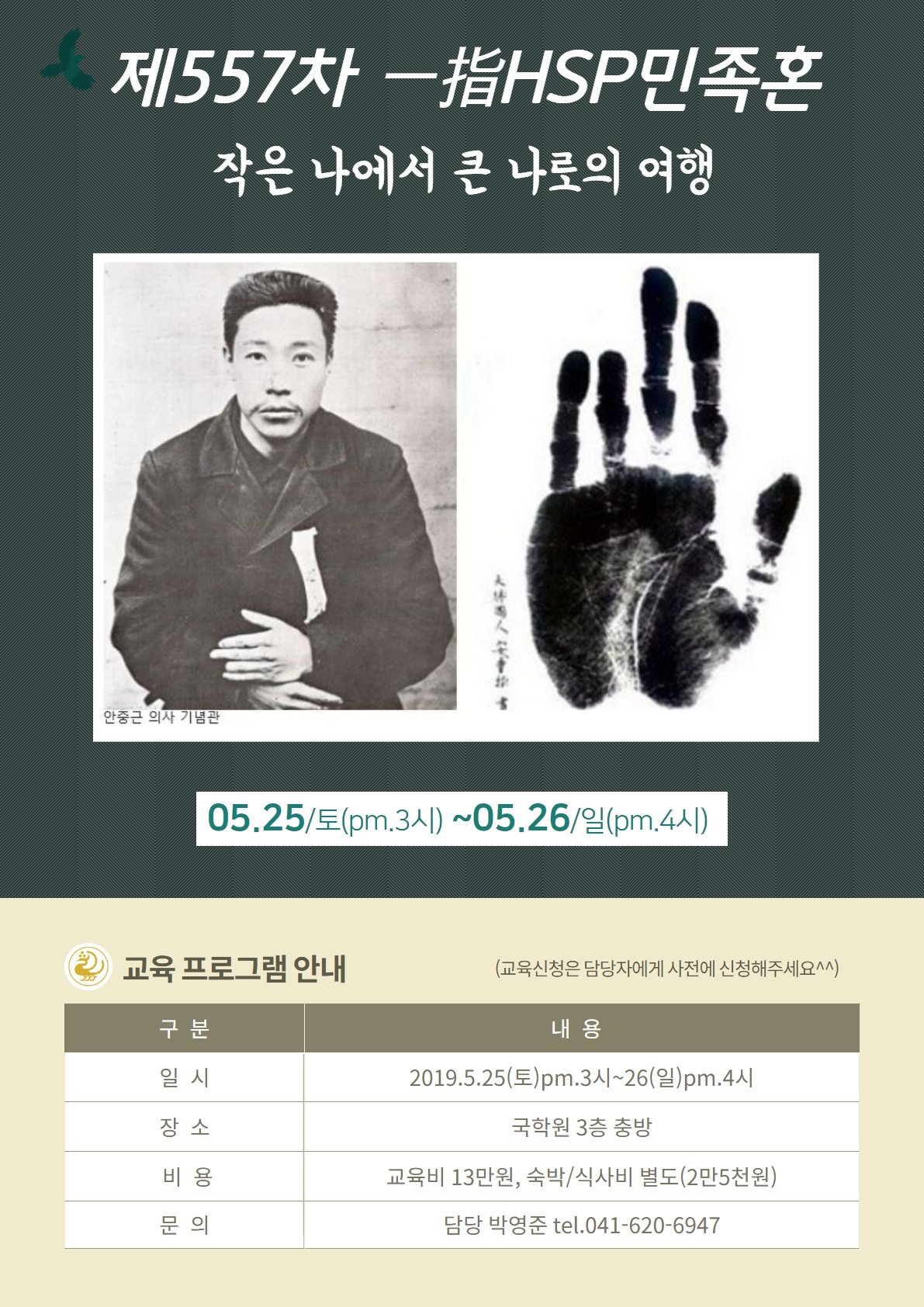 ? [교육일정 안내]1. 일시 : 2019.5.25(토) 오후3시~26일) 오후4시2. 장소 : 국학원 3층 3. 비용 : 교육비 13만원, 숙박/숙식 별도(2만5천원)4. 문의 : 담당 박영준 Tel.041-620-6947