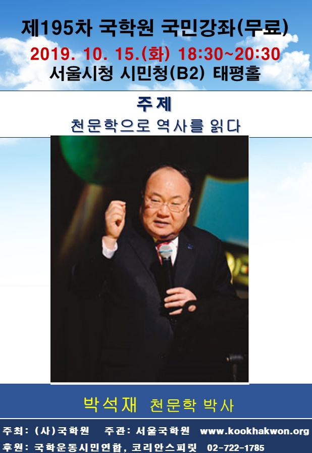 사단법인 국학원(원장 권나은)은 전 한국천문연구원장을 역임한 국제뇌교육종합대학원 대학교 박석재 교수를 초빙하여 “천문학으로 역사를 읽다” 라는 주제로 2019년 10월 15일(화) 오후 6시 30분부터 서울시청 시민청 태평홀(B2)에서 제195회 국민강좌를 개최합니다.