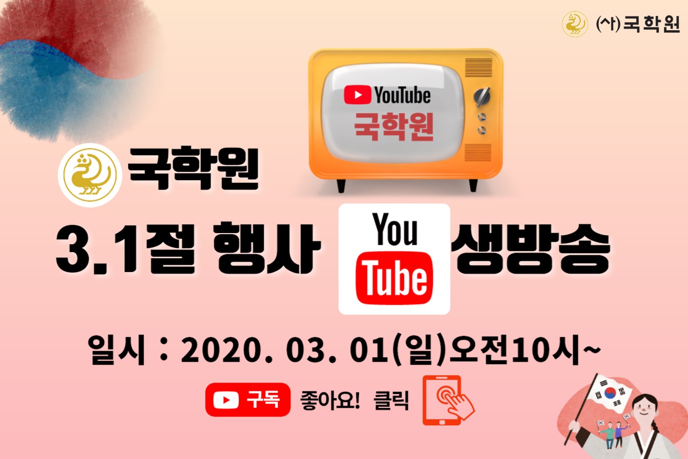 안녕하세요!국학원에서는 '3.1운동 101주년 기념행사'를 '유튜브 실시간 방송'으로 진행합니다.
