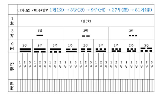 3수 분화의 세계관은.... 하나(1)에서 셋(3)으로 분화되고, 셋이 각각 셋으로 분화되어 아홉(9)이 생겨난다. 이러한 인식틀에서 3은 ‘변화의 계기수’가 되고, 9는 ‘변화의 완성수’가 되며, 9의 자기 복제수인 81(9x9=81)은 ‘우주적 완성수’를 의미한다.
