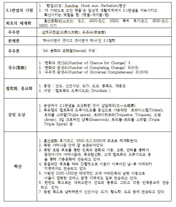 필자는, (1) ‘하나이면서 셋이고 셋이면서 하나’인 3.1(Three in One)관념을 바탕으로 한 3.1철학을 ‘본체론적인 논리’를 지니고, (2) 하나에서 둘을 거치지 않고 셋으로 지속적으로 분화되는 ‘3수 분화의 프랙탈(fractal) 구조’에 기초한 ‘우주론적 자기 전개의 논리’를 지니며, (3) 이 과정에서 탄생하는 3, 9(3×3), 81(9×9)이 특별한 상징성을 지닌 성수로 사용되는 북방 샤머니즘의 일련의 사유체계를 ‘3수 분화의 세계관’이라고 부른다.