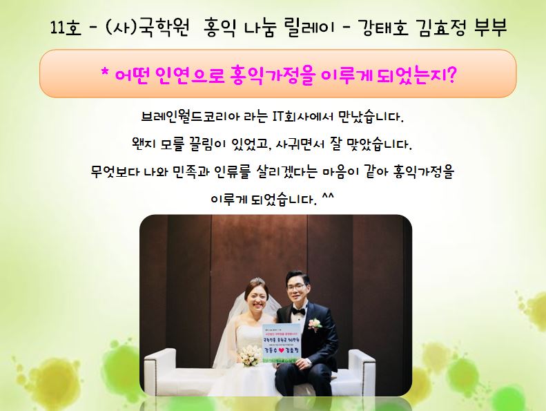 10호 - (사)국학원 홍익나눔 릴레이 - 양상훈 임다운 부부* 어떤 인연으로 홍익가정을 이루게 되었는지? 두 사람 모두 함께 같은 직장을 다니고 있었습니다. 처음에는 같이 출퇴근을 하게 되며 이야기를 나누게 되었..